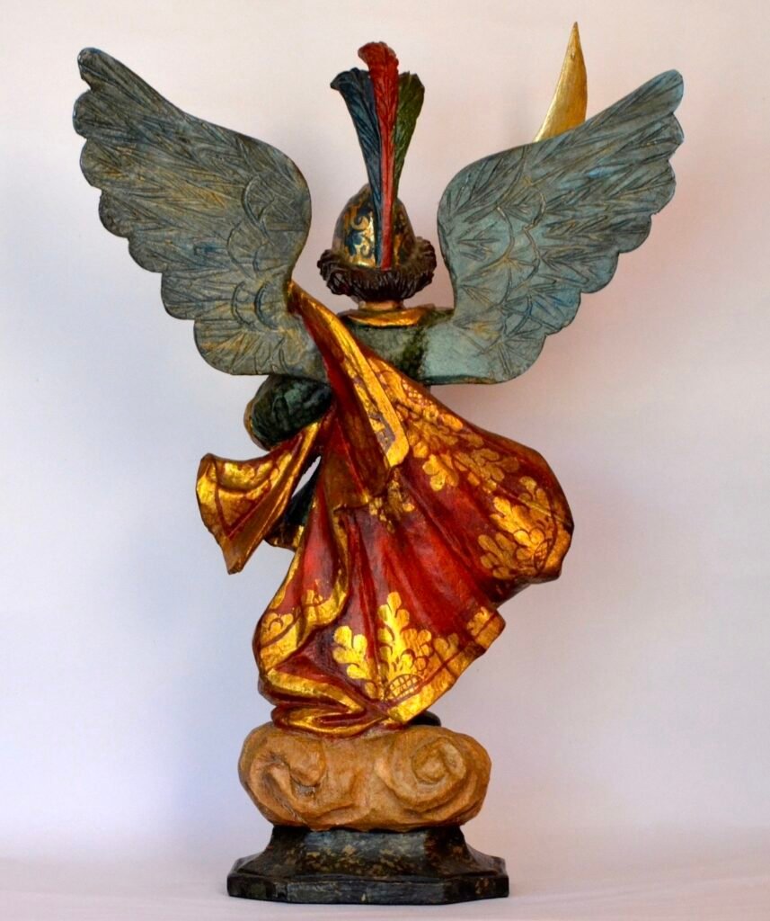 Tallado en madera y trabajado con una policromía intensa, responde a la tradición novohispana mexicana, heredera del barroco colonial, donde lo sagrado no es frágil ni etéreo, sino activo, terrenal y simbólicamente armado. Aquí no hay dulzura pastel: hay tensión, jerarquía, vigilancia.