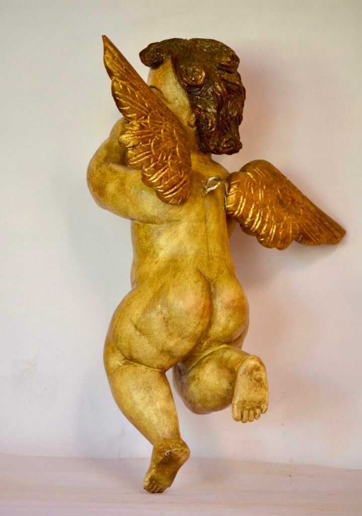 Este ángel brasileño —mitad putto barroco, mitad niño travieso atrapado en pleno vuelo— trae consigo la herencia de Minas Gerais, pero también algo más doméstico, más actual, más humano que celestial.