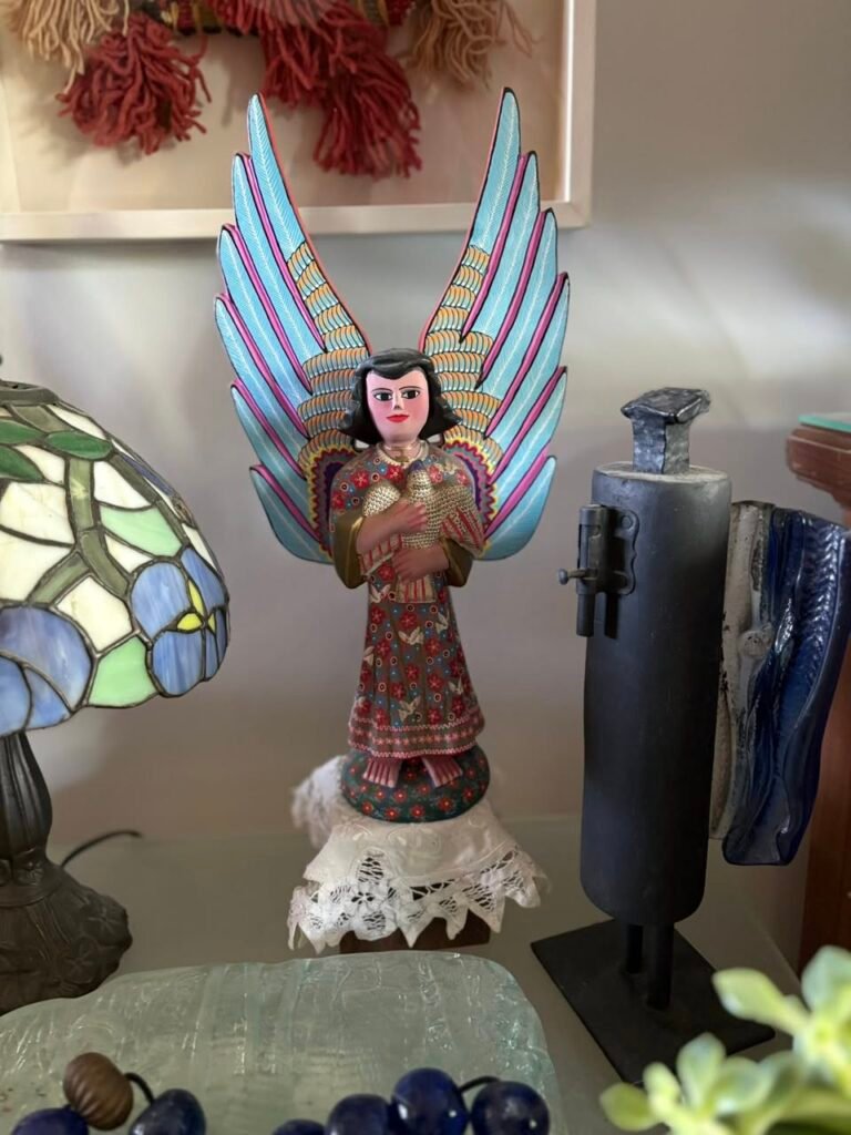 Este ángel de San Martín Tilcajete —tallado y pintado por María Jiménez Ojeda, artesana zapoteca heredera de una tradición ferozmente viva— es uno de esos objetos que llegan para ocupar un lugar definitivo en la mesa de devociones íntimas.