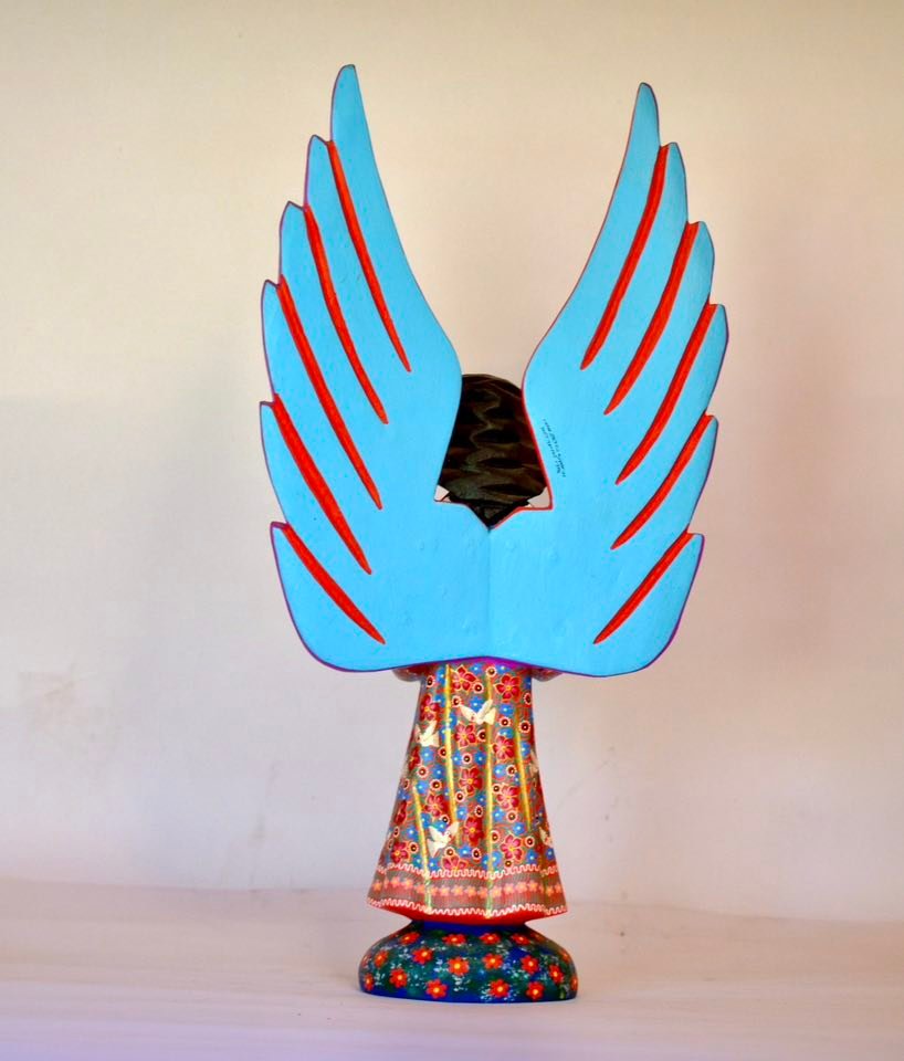 Tallado en madera de copal, el material sagrado del valle de Oaxaca, el ángel despliega unas alas monumentales que son puro Tilcajete: geometrías filosas, líneas que parecen bordadas con pinceles microscópicos y una paleta sin miedo al color.