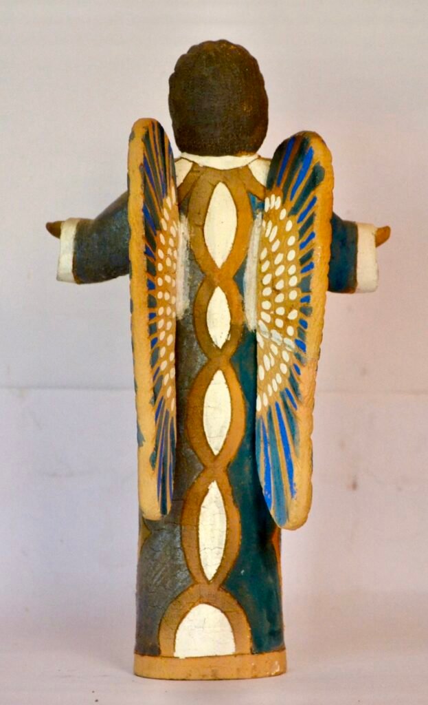Los motivos geométricos que recorren túnica y alas remiten tanto al textil indígena como a la ornamentación prehispánica, integrando el imaginario cristiano en una cosmovisión más antigua, persistente y silenciosa.