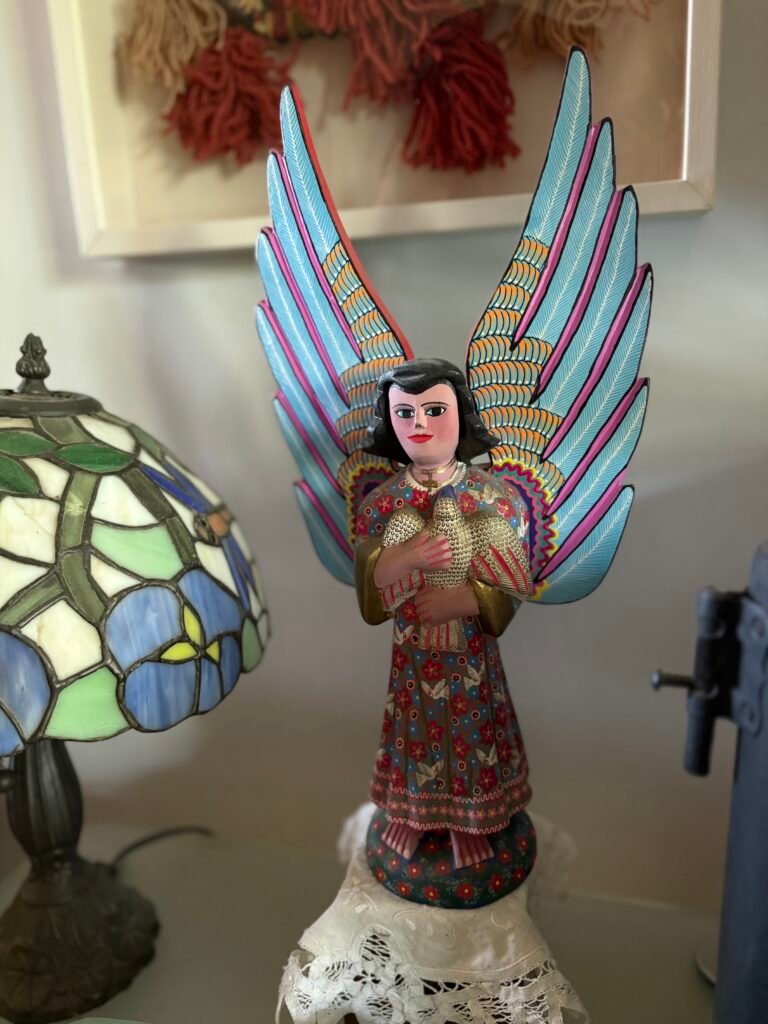 Este ángel de San Martín Tilcajete —tallado y pintado por María Jiménez Ojeda, artesana zapoteca heredera de una tradición ferozmente viva— es uno de esos objetos que llegan para ocupar un lugar definitivo en la mesa de devociones íntimas.