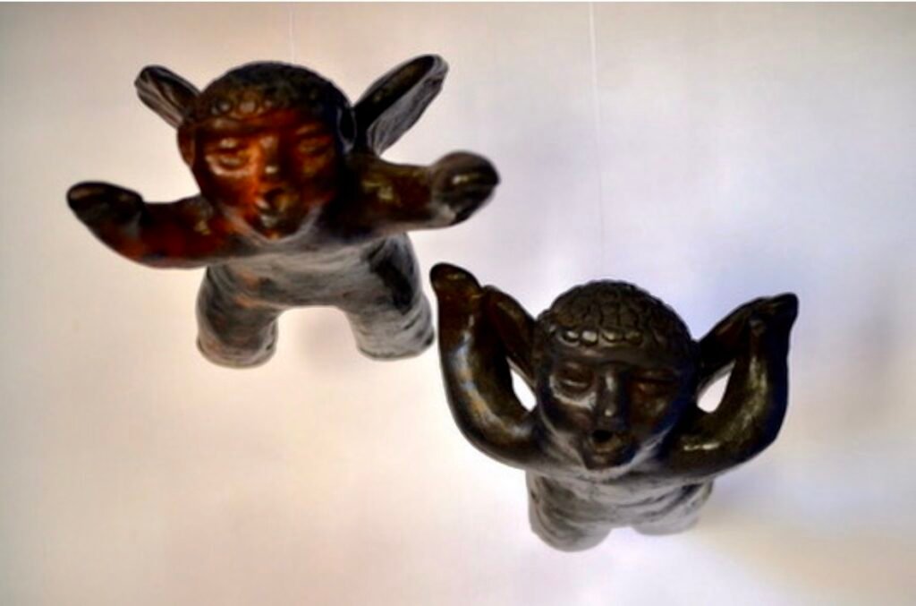 Estos angelitos negros, realizados en barro cocido por Carolina Noguera (Tobatí, Paraguay, 1972), condensan una de las expresiones más honestas y conmovedoras de la cerámica popular paraguaya contemporánea.