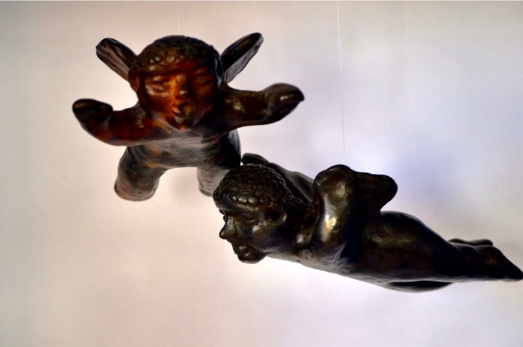 Pequeños en escala pero densos en presencia, no flotan: avanzan. Son figuras compactas, de brazos abiertos, con alas que no se exhiben sino que se integran al gesto del cuerpo.