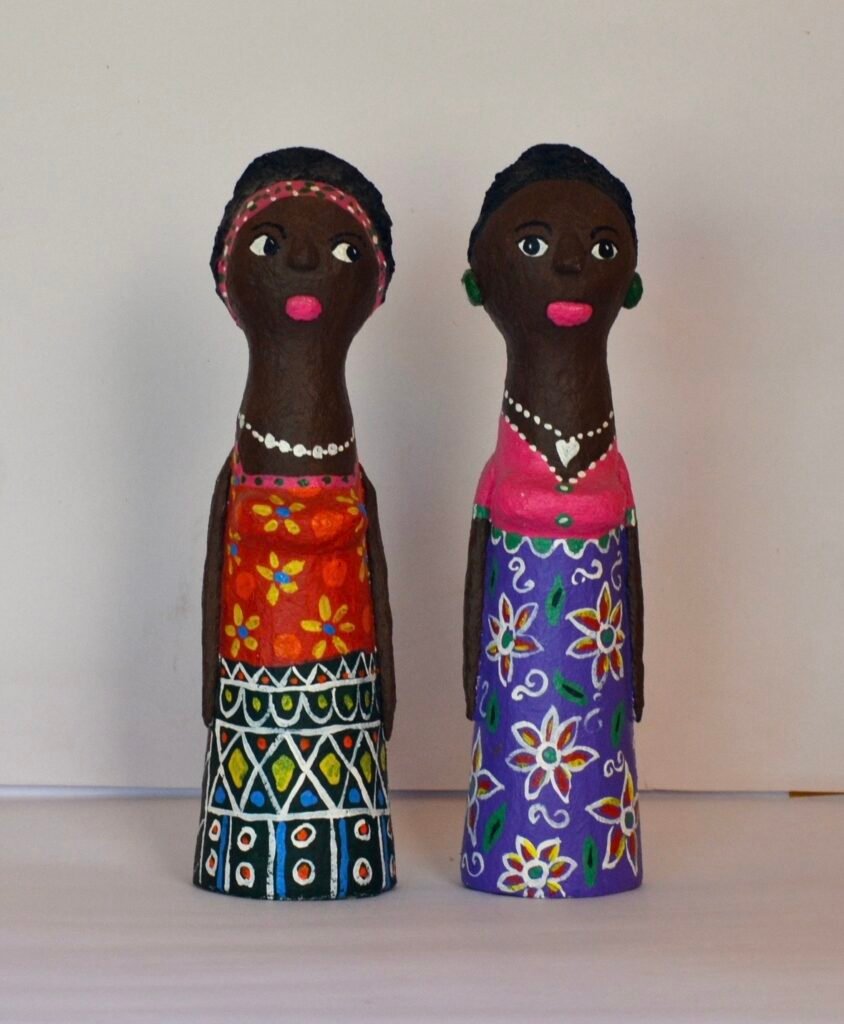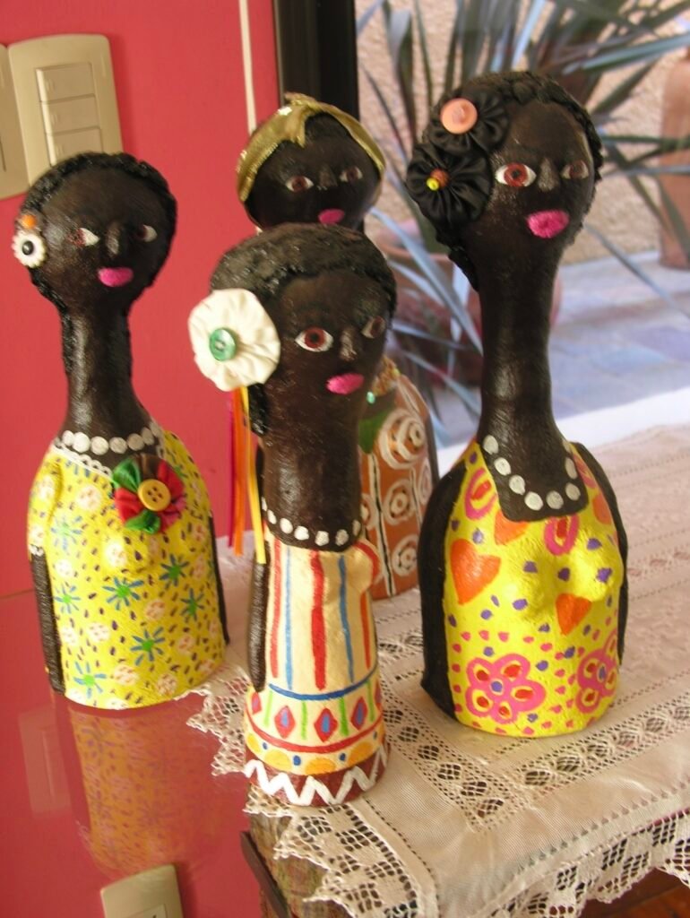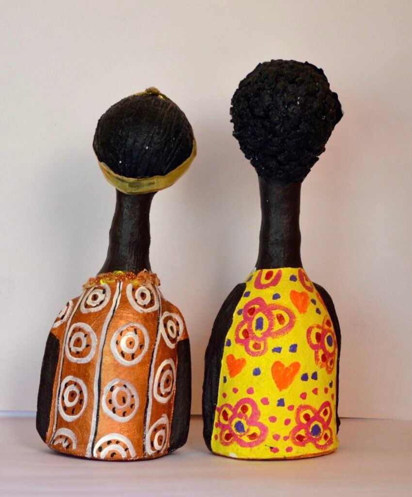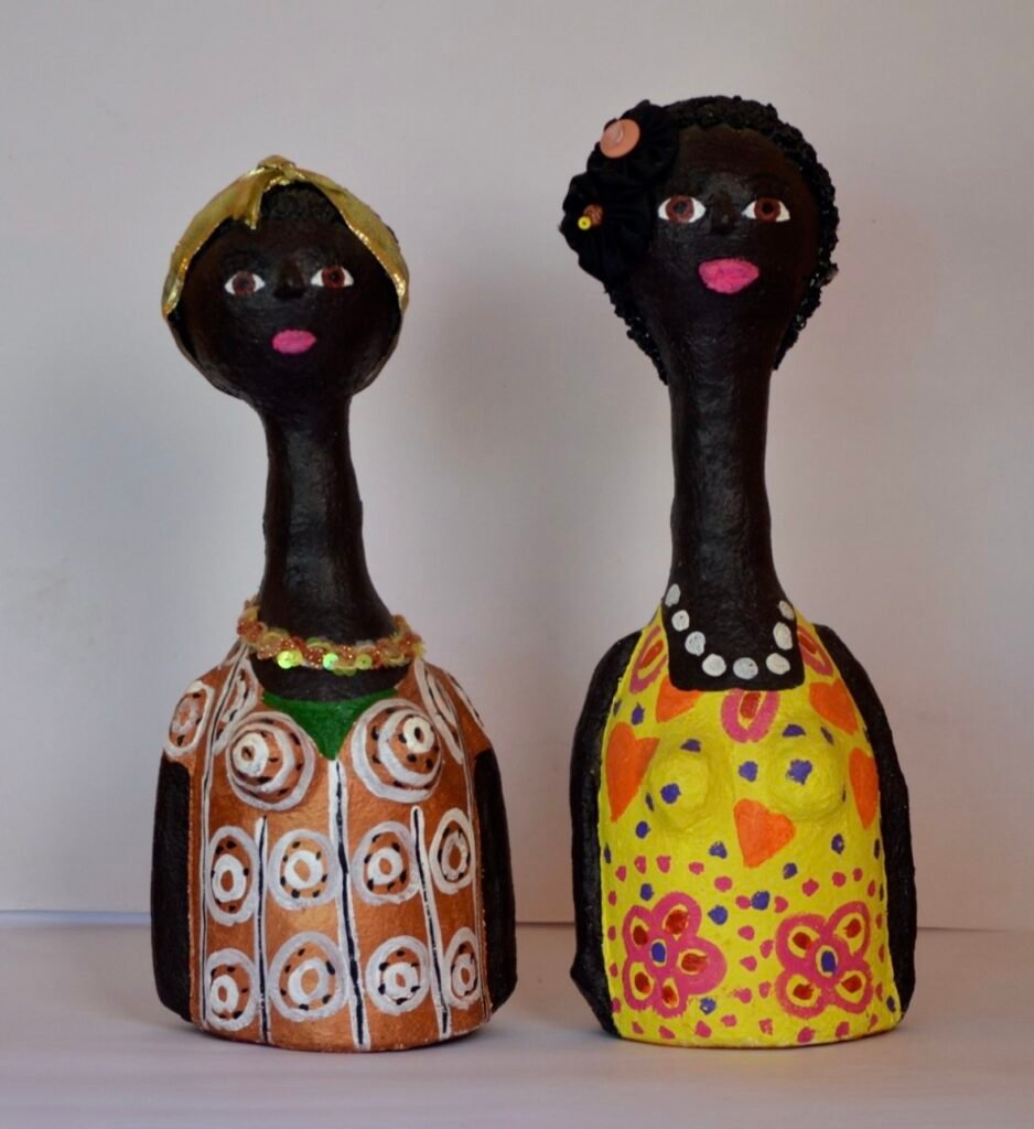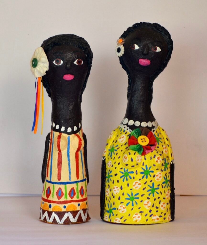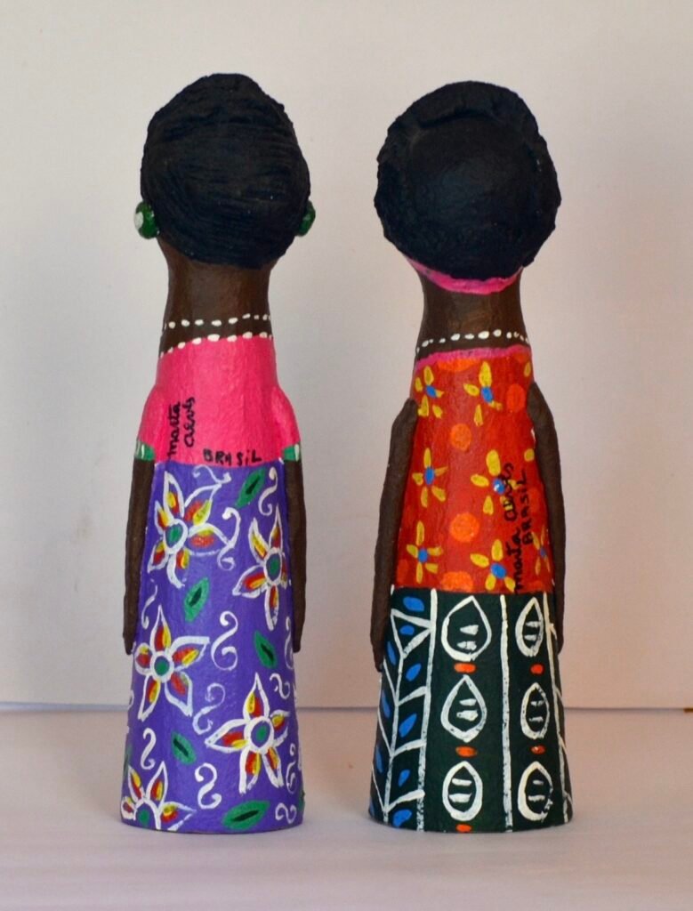 Figuras estilizadas, cuellos largos, cuerpos mínimos. Papel modelado y pintado a mano, con colores planos y patrones rítmicos que dialogan entre lo popular brasileño y una síntesis casi moderna.