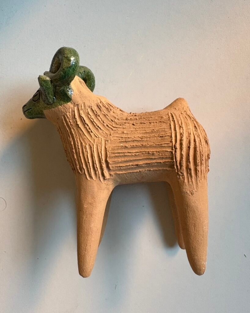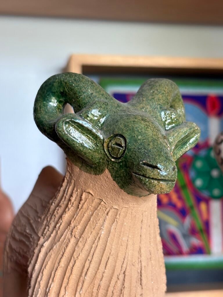 Aquí, el gesto es claro —directo—, sin ornamentos innecesarios. El esmalte verde en la cabeza irrumpe como un guiño actual, casi lúdico, aunque el original es igual, que rompe la rusticidad del cuerpo y le da un pulso propio.