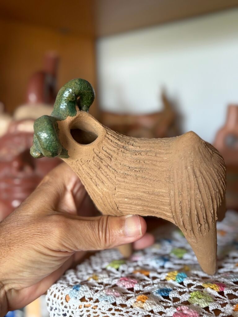Incluso el pequeño hueco en su lomo —detalle que podría pasar desapercibido— revela su inteligencia material. Pudo haber sido concebido como respiradero durante la cocción, como entrada de aire para funcionar como silbato, o bien como un discreto receptáculo para una flor, una ramita o una vela.