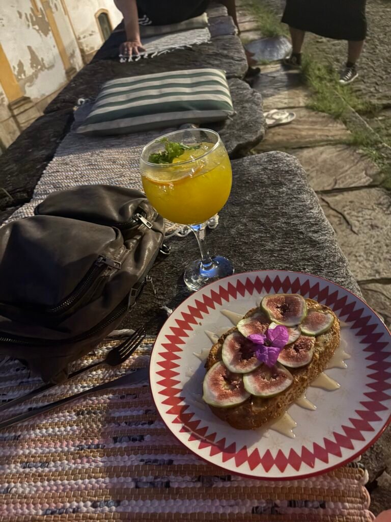 higos laminados, crema de queso minas, hilos de miel y una flor de Santa Rita, que me comí, sobre una rebanada generosa de pan de masa madre artesanal.