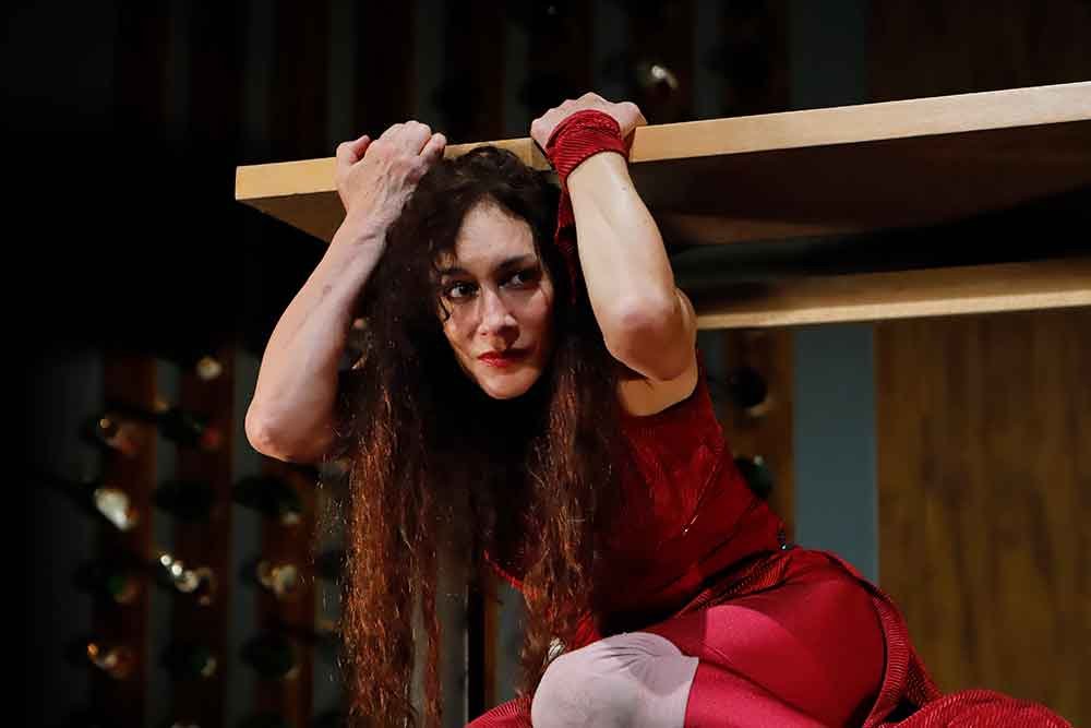 En apenas una hora, la actriz despliega una interpretación hipnótica, sostenida en una escenografía mínima y un vestuario en tonos borgoña y rojo.