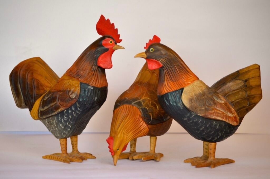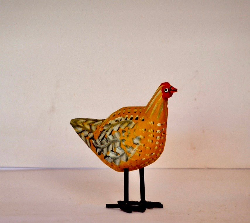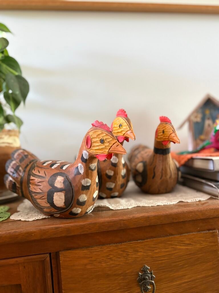 Las gallinas chilenas, talladas en madera firme, llegan del campo sin pedir permiso. Son compactas, honestas, sin color sobrante. No están hechas para agradar sino para durar. Campo real, manos curtidas, oficio heredado.