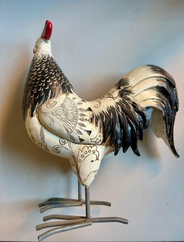 El gallo del norte de España, regalo de mi esposa, cambia el tono. Más contenido, más simbólico. Cuerpo trabajado, decoración incisa, patas metálicas que lo elevan. No grita color: observa. Es gallo de casa antigua, de linaje, de tradición que se hereda.