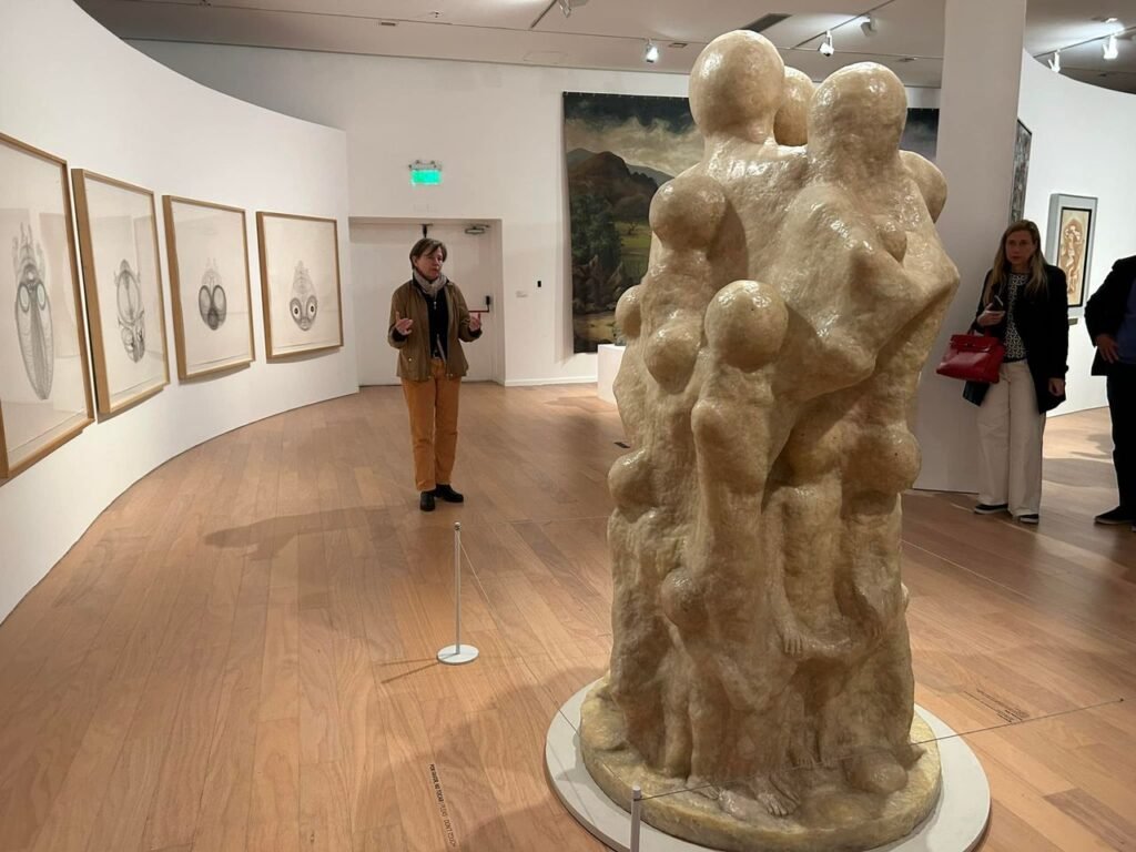 La pieza es desconcertante, como la mayoría de sus obras. Está compuesta por una gran masa donde emergen 21 cabezas con 42 ojos.