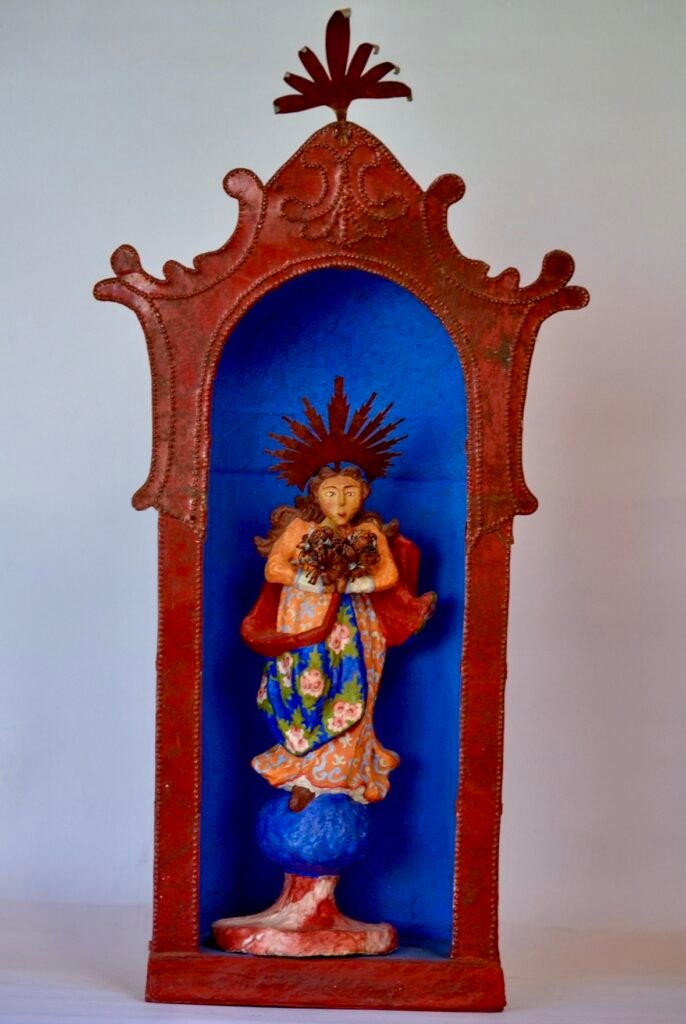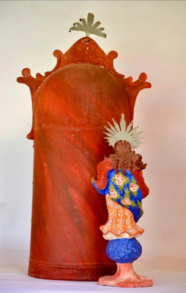 El oratorio, por su parte, funciona como un escenario y está compuesto por papel policromado, volumen semicilíndrico, decorado con hojalata, una estructura que cita los oratórios domésticos del siglo XVIII–XIX, reinterpretados hoy como contenedores de memoria y afecto.
