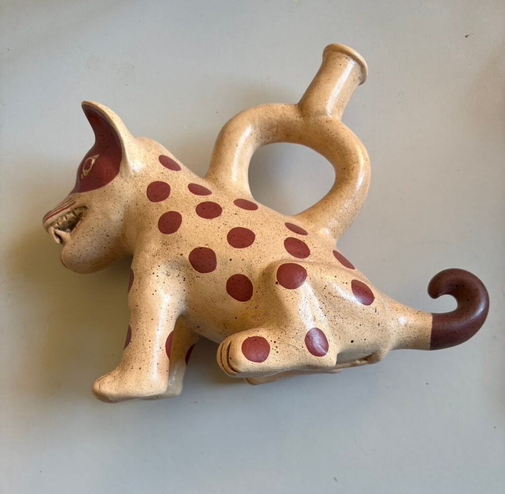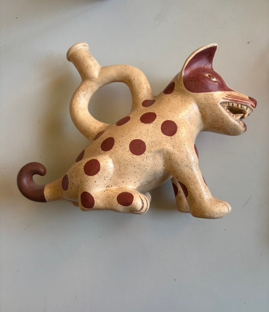 En Perú, el perro sin pelo no es solo un animal, es símbolo, compañía ancestral, calor en las noches frías. Pero esta pieza decide cruzar la línea. Toma al viringo y lo contamina con otra cosa, con la estética de antiguas culturas que no representaban mascotas, sino fuerzas.