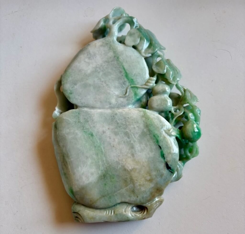 Tallada en jadeíta, material importado históricamente desde Birmania y altamente valorado desde la dinastía Qing, la obra aprovecha con inteligencia las vetas naturales del mineral. Los verdes intensos emergen como pulsaciones de vida entre tonos más lechosos y grises.
