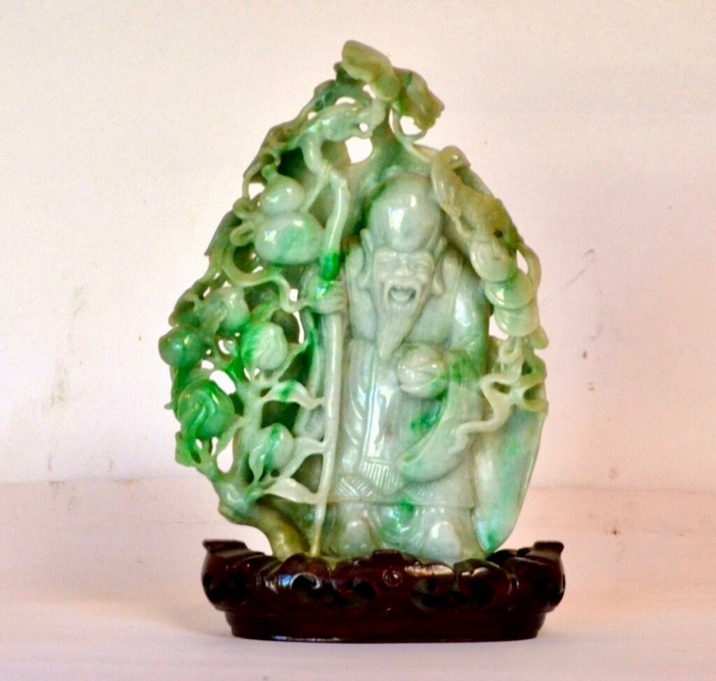 La pieza representa a un sabio taoísta, figura central de la tradición china asociada a la longevidad, la sabiduría y el retiro del mundo.