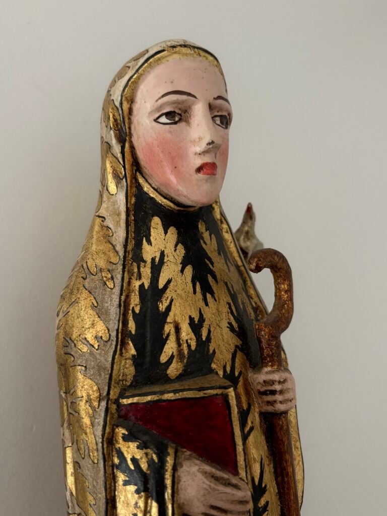 *Decoración del manto —simétrica, con diseño casi heráldico— refuerza la autoridad espiritual de esta santa.