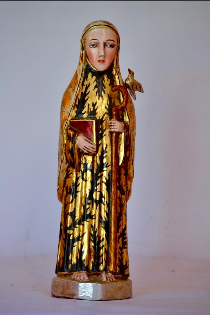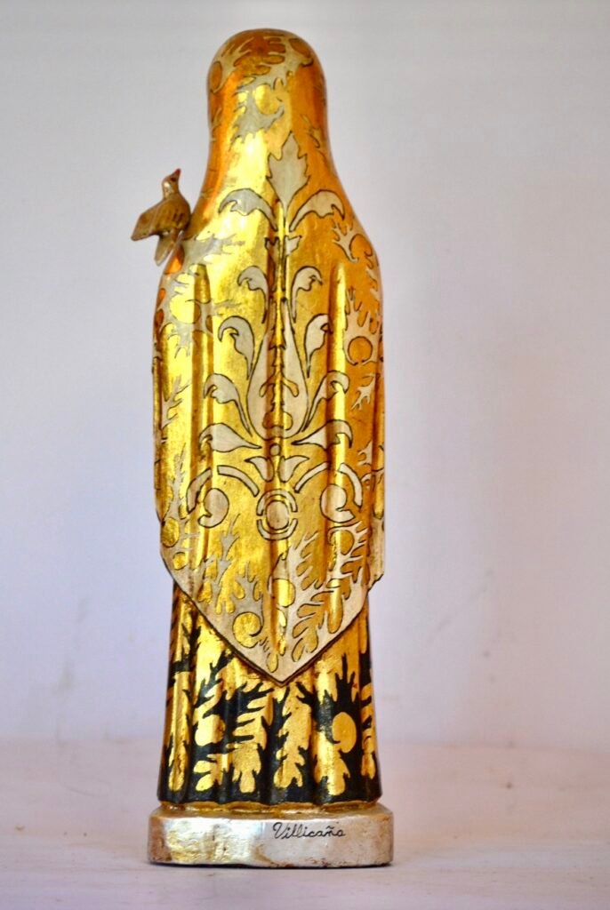 Esta figura —madera tallada, policromada y dorada al pan de oro— pertenece a la tradición de imaginería popular latinoamericana del siglo XX. No es barroco colonial original. Es una relectura neocolonial o andina donde el oro no es ostentación sino símbolo.