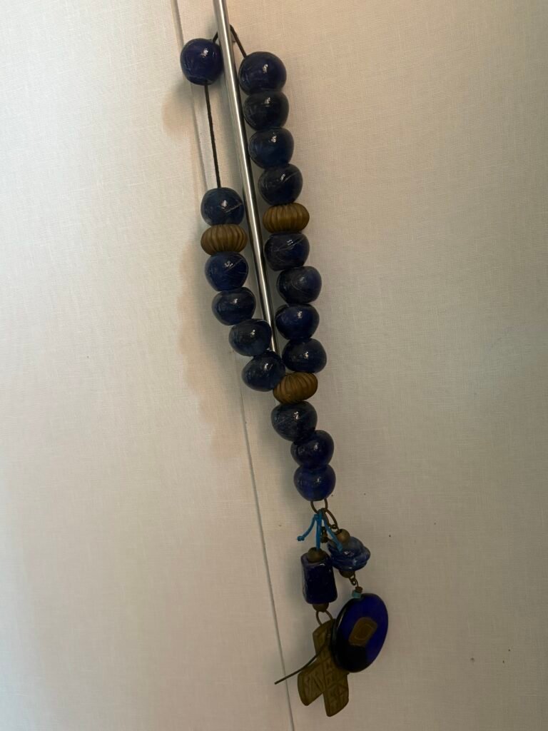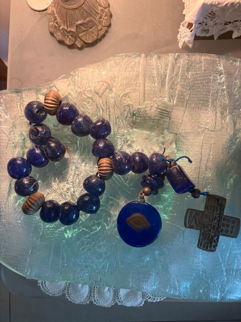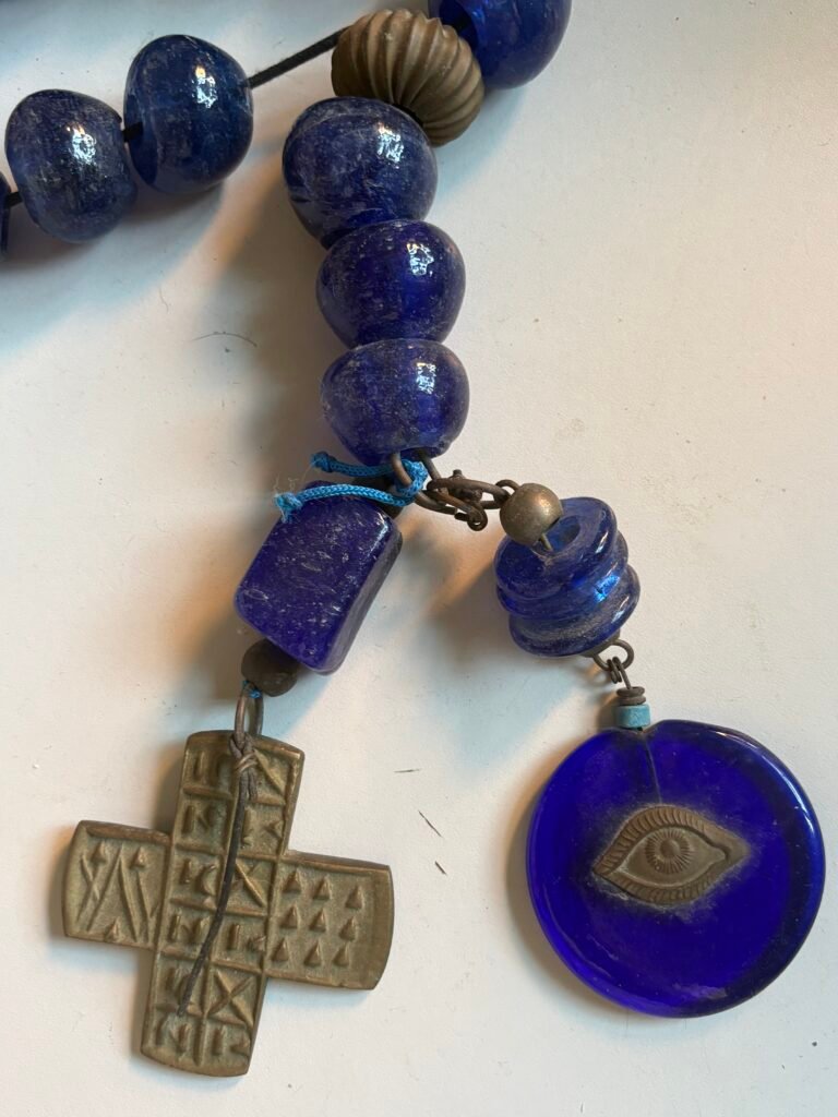Era Atenas hace 33 años. Calor mineral, mármol gastado y ese azul que no es un color sino una declaración. Entre íconos ortodoxos y souvenirs previsibles apareció esta pieza: cuentas gruesas de vidrio azul cobalto, una cruz grabada de aire bizantino y, colgando sin pedir permiso, el ojo vigilante del Mediterráneo.