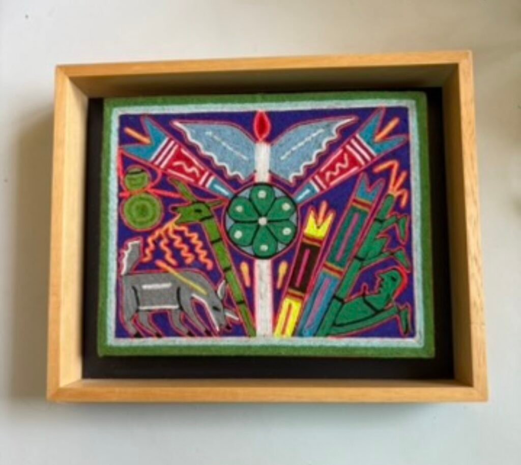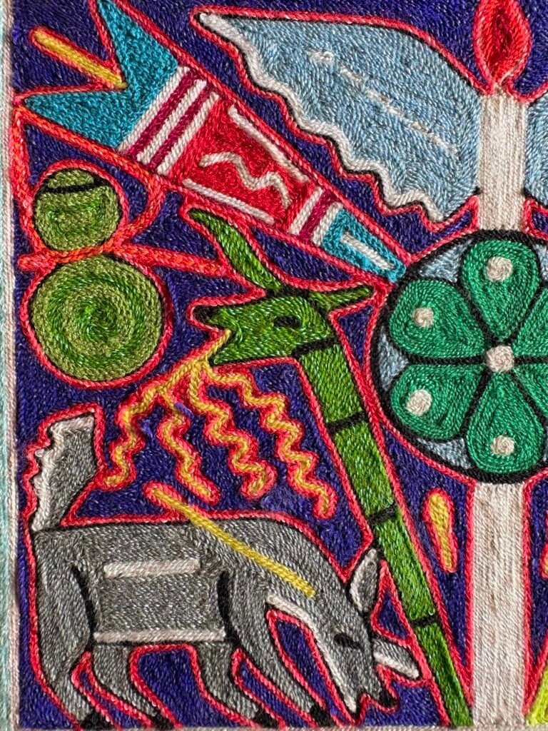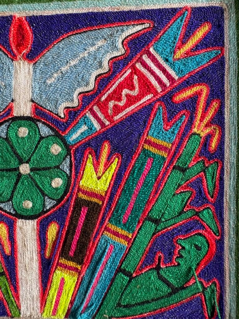 Y acá la precisión clave pues no se trata de un bordado ni chaquira (mostacillas) típicas de los huicholes. Es una pintura de estambre (lana) compuesta por hilos de colores presionados uno a uno sobre una base cubierta con cera o resina, construyendo la imagen por contacto, no por tejido.