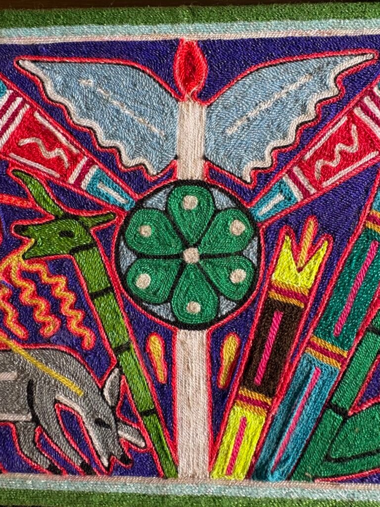 es cosmovisión pura en acto, una traducción visual de visiones rituales donde el venado guía, el peyote (cactus) revela y el chamán media.