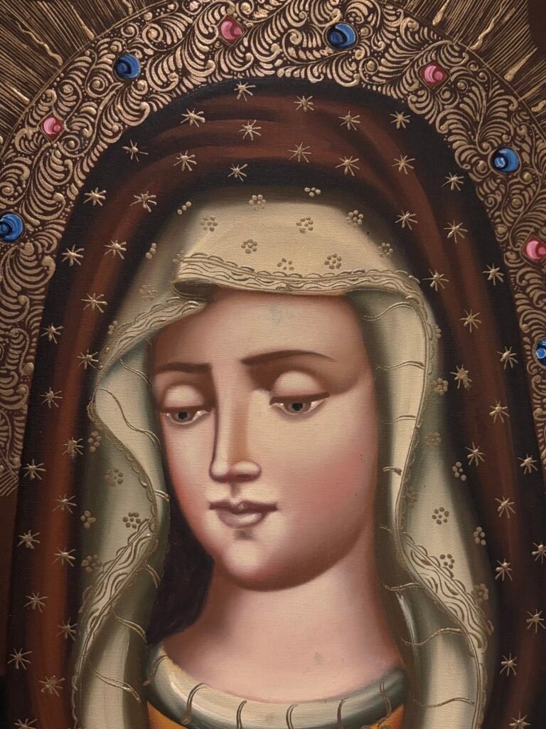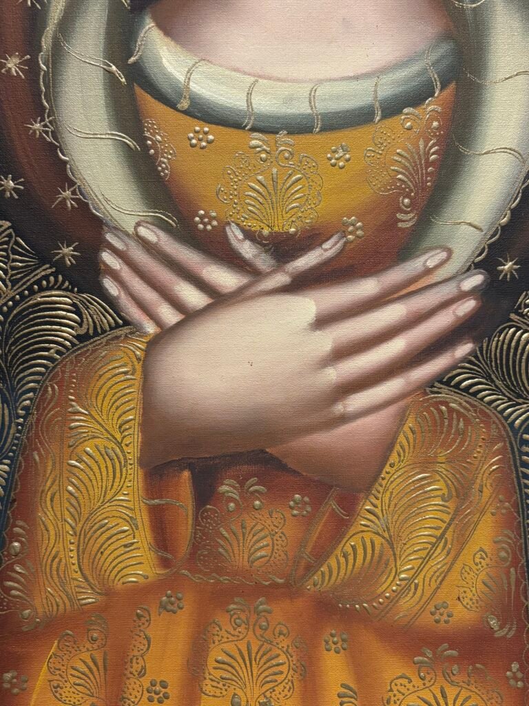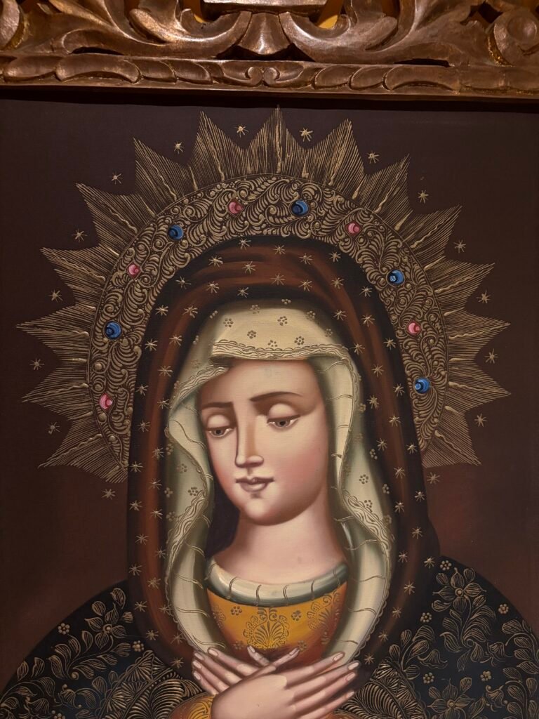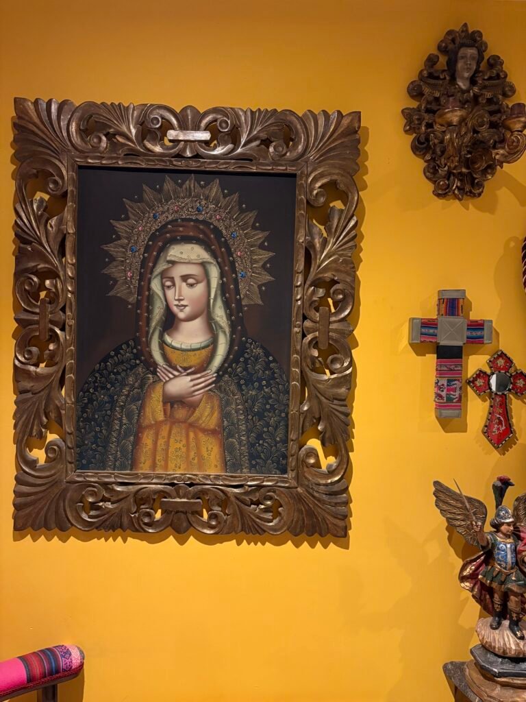 La pintura cusqueña, llegada desde Cusco, juega su propio partido. Virgen recogida, gesto bajo control, oro que no pretende profundidad sino presencia. Su mirada dirigida hacia abajo como señal de humildad y sus manos cruzadas sobre el pecho desvían nuestra mirada más allá de los ornamentos de su vestimenta y corona.