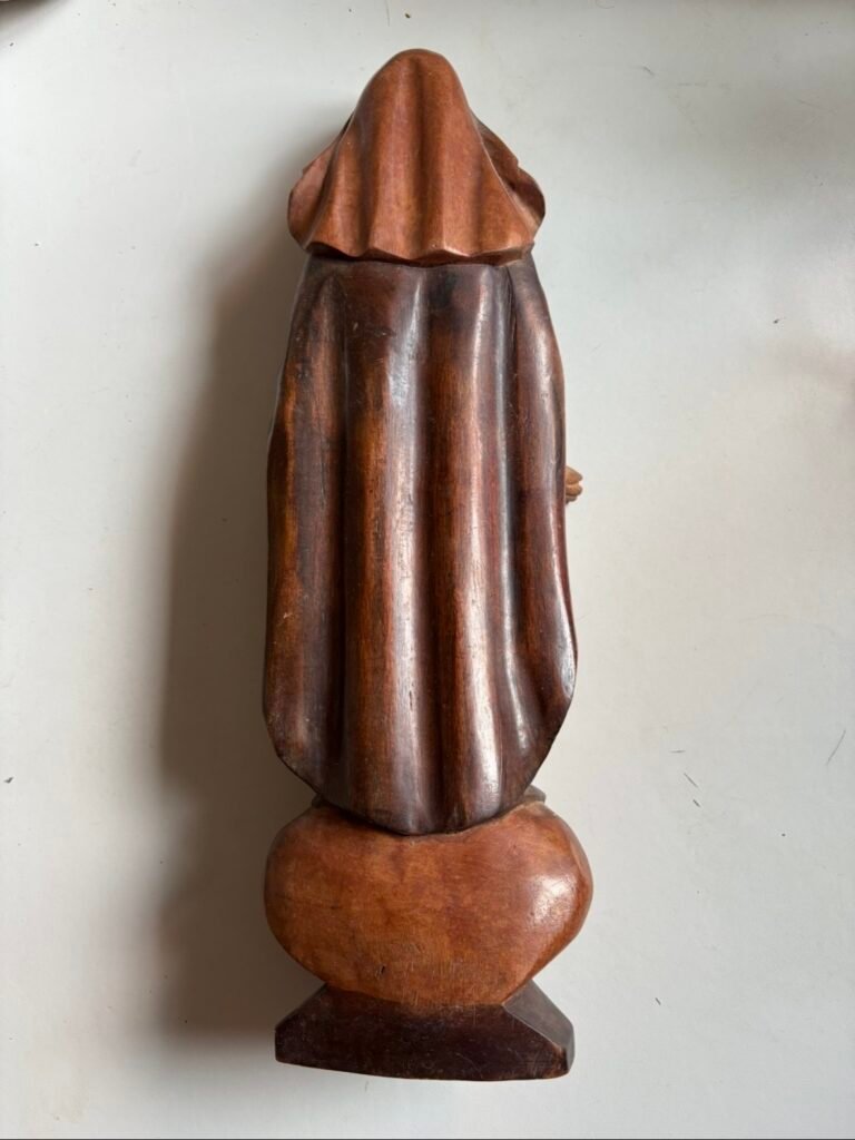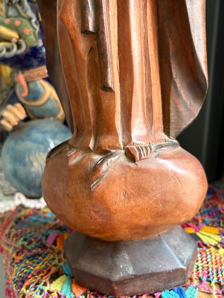 No toda imagen mariana necesita dorado, estofado y teatralidad barroca para sostener presencia. Esta talla en madera, latinoamericana del siglo XX, prescinde del ornamento y se concentra en lo esencial que radica en volumen, gesto y silencio elementos que me supieron cautivar.